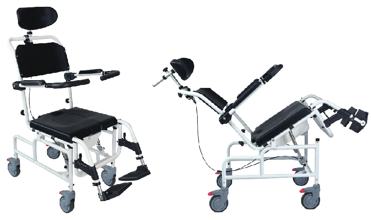 入浴時の姿勢保持や移乗をサポートする、リクライニング機能付きのシャワーチェア。